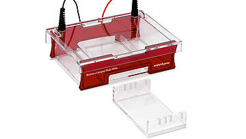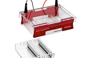 The universal gel casting system is designed for gel tray lengths from 7 cm up to 18 cm. A movable fixing element provide the flexibility required to quickly and securely fix the different length gel trays for the casting of gels. With mobile gel casting dams, multiple gels can simply be poured simultaneously: