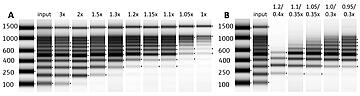 Data showing varying ProNex® chemistry:sample ratios as prepared with the CyBio FeliX. Data collected using either a single size-selective approach (A) or a dual sizes selective approach (B).